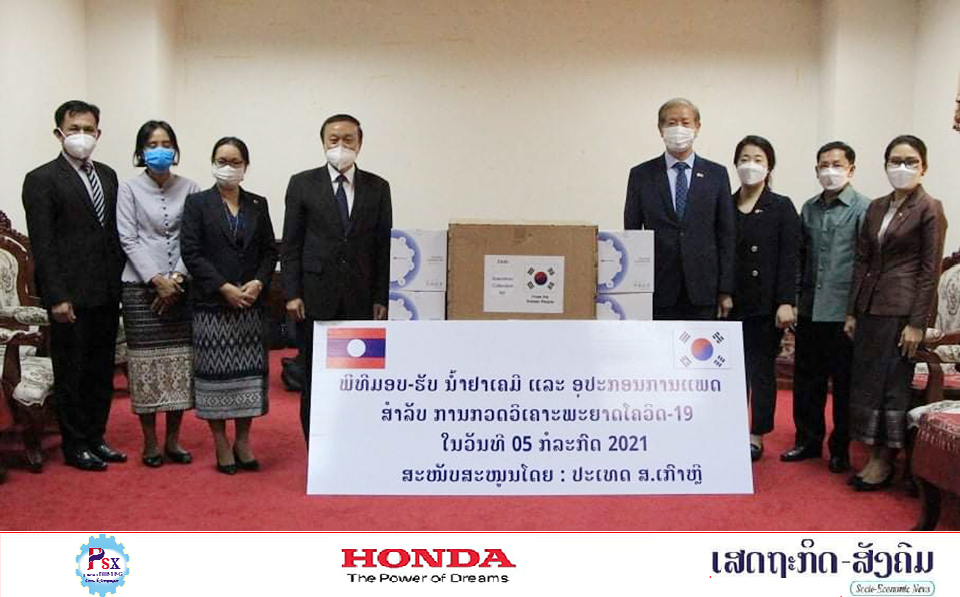 ພິທີມອບເຄື່ອງຊ່ວຍເຫຼືອຕ້ານການລະບາດຂອງພະຍາດໂຄວິດ-19 ປະກອບມີນໍ້າເຄມີກວດຫາເຊື້ອ ແລະອຸປະກອນການແພດມູນຄ່າ 1 ແສນກວ່າໂດລາສະຫະລັດ ຈາກລັດຖະບານ ສ. ເກົາຫຼີ ແກ່ລັດຖະບານ ສປປ ລາວ ໄດ້ຈັດຂຶ້ນໃນວັນທີ 5 ກໍລະກົດ 2021