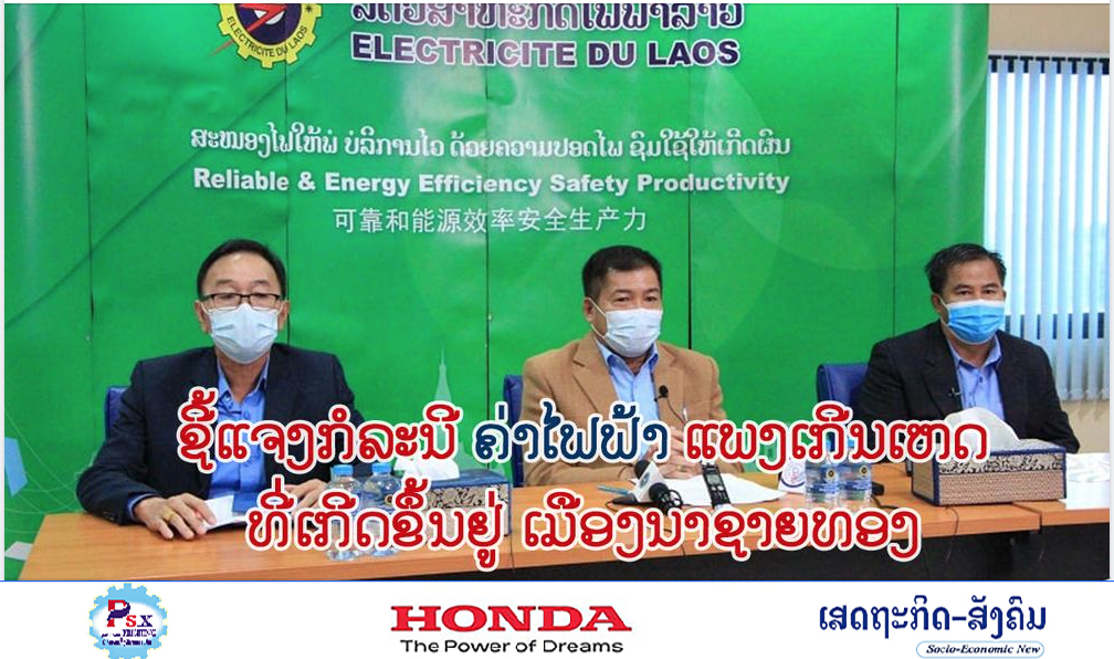 ຕອນບ່າຍວັນທີ 28 ມິຖຸນາ 2021 ລັດວິສາຫະກິດໄຟຟ້າລາວ ນະຄອນຫຼວງວຽງຈັນ ໄດ້ຈັດຖະແຫຼງຂ່າວກ່ຽວກັບການຄິດໄລ່ຄ່າກະແສໄຟຟ້າກໍລະນີເກີດຂຶ້ນຢູ່ເມືອງນາຊາຍທອງ ນະຄອນຫຼວງວຽງຈັນ ຕໍ່ສື່ມວນຊົນປະກອບມີ ທ່ານ ຄຸນ ບົວແພງພັນ ຮອງຜູ້ອໍານວຍການໃຫ່ຍລັດວິສາຫະກິດໄຟຟ້າລາວ,