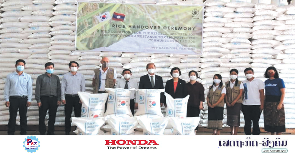 ວັນທີ 23 ມິຖຸນາ 2021 ທີ່ນະຄອນຫຼວງວຽງຈັນ, ລັດຖະບານແຫ່ງສາທາລະນະລັດ ເກົາຫຼີ ໄດ້ນຳເອົາເຂົ້າສານຈ້າວ ຈຳນວນ 1.320 ໂຕນ ມູນຄ່າປະມານ 1,26 ລ້ານໂດລາສະຫະລັດ ມອບໃຫ້ແກ່ລັດຖະບານລາວເພື່ອຊ່ວຍເຫຼືອຊຸມຊົນຜູ້ທີ່ໄດ້ຮັບຜົນກະທົບຈາກໄພພິບັດທໍາມະຊາດທີ່ເກີດຂຶ້ນ ໃນ ສປປ ລາວ,