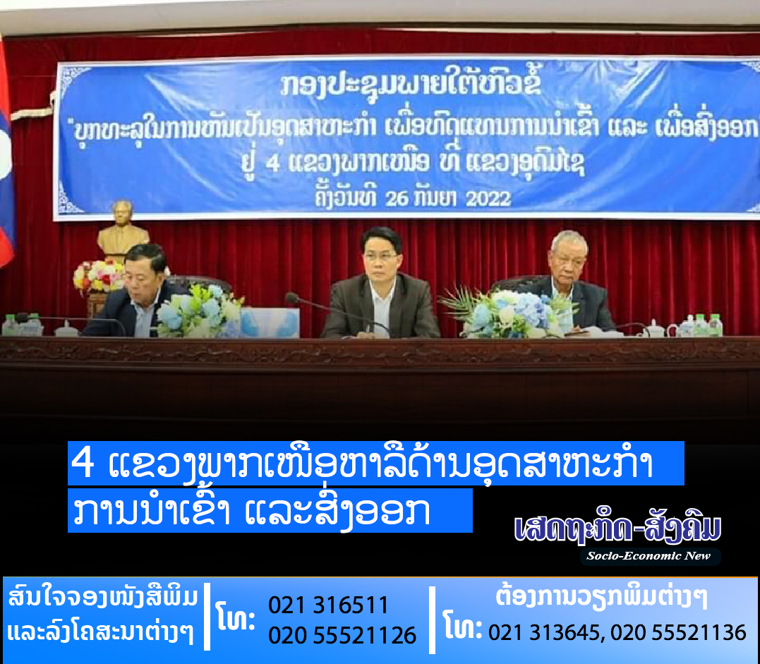 ກອງປະຊຸມປຶກສາຫາລືພາຍໃຕ້ຫົວຂໍ້ ບຸກທະລຸ ໃນການຫັນເປັນອຸດສາຫະກໍາ ເພື່ອທົດແທນການນຳເຂົ້າ ແລະສົ່ງອອກ 4 ແຂວງພາກເໜືອ ຈັດຂຶ້ນໃນວັນທີ 26 ກັນຍາ 2022 ທີ່ຫ້ອງວ່າການແຂວງອຸດົມໄຊ ໂດຍການເປັນປະທານຮ່ວມຂອງທ່ານ ບຸນຄົງ ຫລ້າຈຽມພອນ ເຈົ້າແຂວງອຸດົມໄຊ