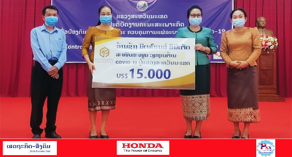 ບໍລິສັດ ລ້ານຊ້າງ ມີເນໂຣນສ໌ ລິມິເຕັດ (ລຊມລ) ບໍ່ຄຳ-ທອງເຊໂປນ ໄດ້ມອບເງິນຊ່ວຍເຫຼືອ 15.000 ໂດລາ ໃຫ້ແກ່ແຂວງສະຫວັນນະເຂດເພື່ອສະ 1 ໜັບສະໜູນວຽກງານປ້ອງການ ແລະຕ້ານການລະບາດຂອງພະຍາດ COVID-19.
