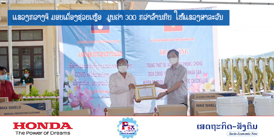 ເພື່ອເປັນການປະກອບສ່ວນເຂົ້າໃນວຽກງານສະກັດກັ້ນ, ຄວບຄຸມ ແລະ ແກ້ໄຂການແຜ່ລະບາດຂອງເຊື້ອພະຍາດ ໂຄວິດ-19 ຢູ່ແຂວງສາລະວັນ, ໃນວັນທີ 18 ພຶດສະພາ 2021 ນີ້ ແຂວງກວາງຈີ ສສ ຫວຽດນາມ ໄດ້ປະກອບສ່ວນມອບເຄື່ອງຊ່ວຍເຫຼືອໃຫ້ອົງການປົກຄອງ ແຂວງສາລະວັນ ຊຶ່ງປະກອບມີຄື: