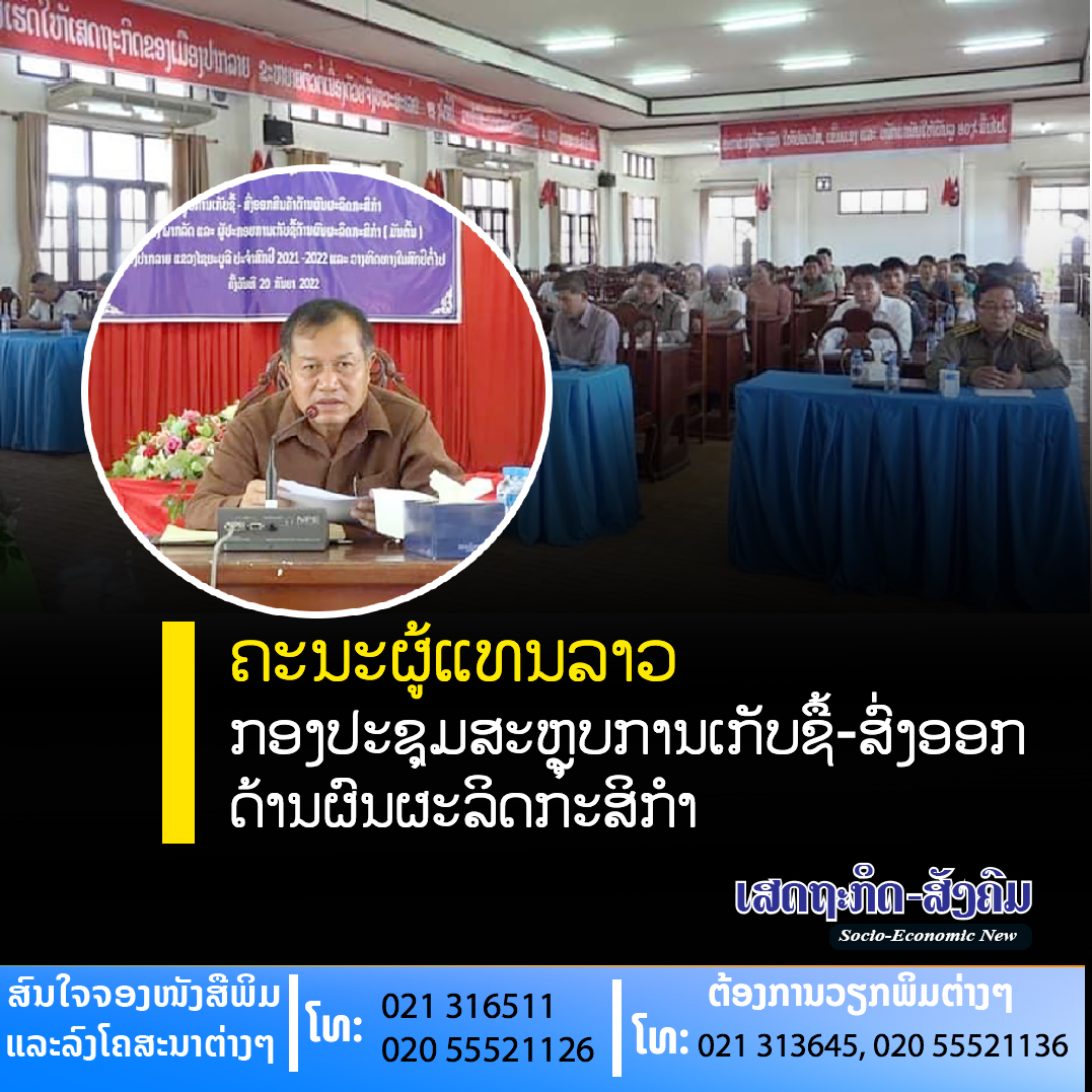 ກອງປະຊຸມສະຫຼຸບການເກັບຊື້-ສົ່ງອອກດ້ານຜົນຜະລິດກະສິກໍາລະຫວ່າງພາກລັດ ແລະຜູ້ປະກອບການເກັບຊື້ມັນຕົ້ນປະຈໍາສົກປີ 2021-2022 ແລະແຜນການ 2022-2023 ໃນທົ່ເມືອງປາກລາຍແຂວງໄຊຍະບູລີ ໄດ້ຈັດຂຶ້ນໃນວັນທີ 20 ກັນຍາຜ່ານມານີ້,