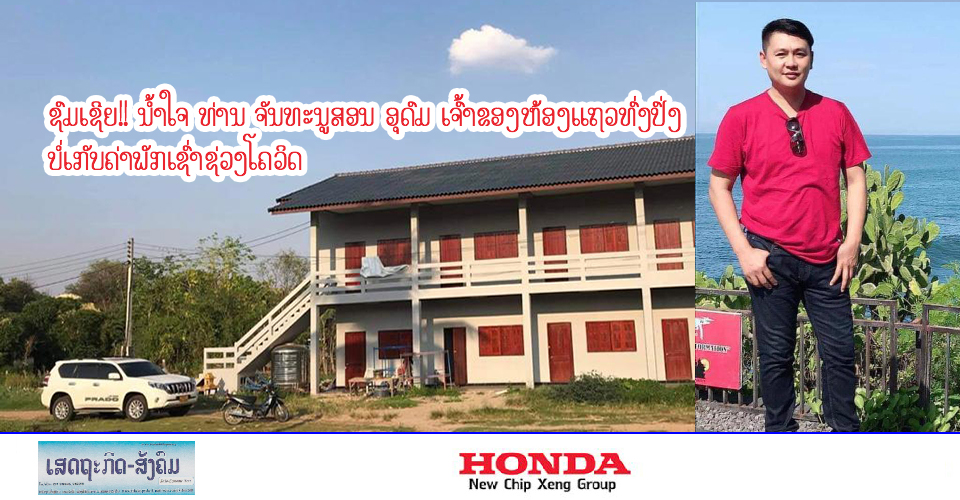 ຊົມເຊີຍ ຄົນລາວທີ່ມີນໍ້າໃຈ ແລະຊ່ວຍເຫຼືອກັນໃນຍາມວິກິດໂດຍສະເພາະຊ່ວງໂລກລະບາດພະຍາດໂຄວິດ-19 ທ່ານ ຈັນທະນູສອນ ອຸດົມ ເຈົ້າຂອງຫ້ອງແຖວບ້ານທົ່ງປົ່ງຂ້າງໂຮງໝໍປົ່ວຕາເພິ່ນໄດ້ແຈ້ງຈະບໍ່ເກັບຄາເຊົາຈົນໂຄວິດຈະຫາຍຈາກບ້ານເຮົາເຮັດໃຫ້ປະຊາຊົນທຳມາຫາກິນໄດ້.