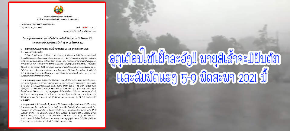 ກົມອຸຕຸນິຍົມ ແລະອຸທົກກະສາດແຈ້ງເຕືອນເພື່ອເຝົ້າລະວັງສະພາບອາກາດຮ້ອນເອົ້າຫຼາຍ ແລະພາຍຸຝົນຕົກຟ້າຮ້ອງຟ້າເຫຼື້ອມ-ລົມພັດແຮງໃນໄລຍະວັນທີ 05 ຫາ 09 ພຶດສະພາ 2021ນີ້ ເນື່ອງຈາກຄວາມກົດດັນຕໍ່າຂອງອາກາດຮ້ອນຍັງຈະປົກຄຸມຢູ່ທົ່ວທຸກພາກຂອງປະເທດລາວ,
