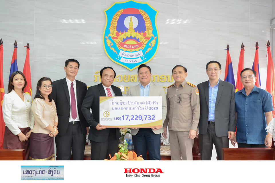 ບໍ່ດົນຜ່ານມານີ້ບໍລິສັດລ້ານຊ້າງ ມິເນໂຣນສ໌ ລິມິເຕັດ (ລຊມລ) ບໍ່ຄຳທອງເຊໂປນໄດ້ມອບແຊັກເງິນອາກອນກຳໄລຂອງປີ 2020 ຈຳນວນ 17,22 ລ້ານໂດລາ ປະມານ 158 ຕື້ກີບ ໃຫ້ແກ່ທ່ານ ທຳມະລົດ ຣາຊາພົນ, ຮອງຫົວໜ້າກົມສ່ວຍສາອາກອນ, ກະຊວງການເງິນ.
