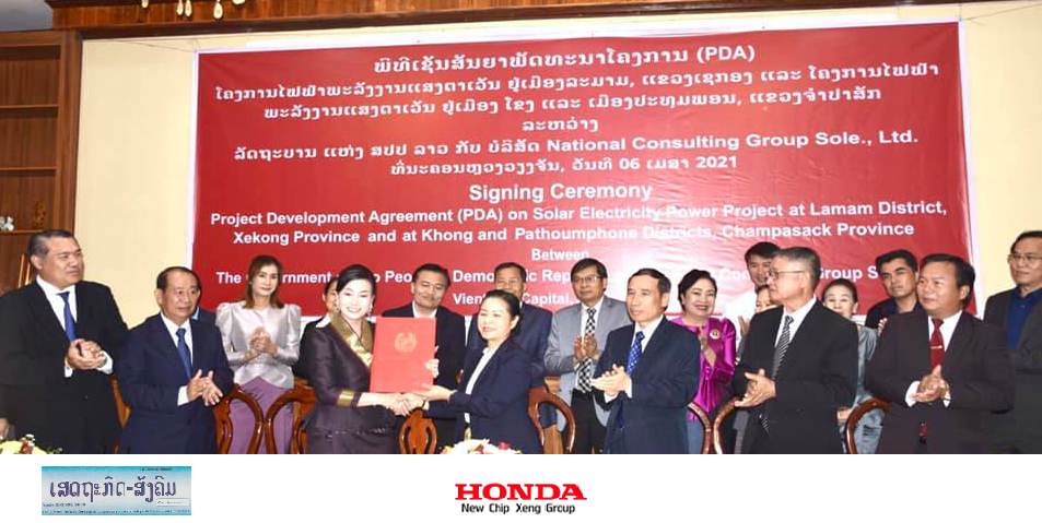ວັນທີ 6 ເມສາ ຜ່ານມາທີ່ກະຊວງແຜນການ ແລະການລົງທຶນພິທີເຊັນສັນຍາພັດທະນາໂຄງການ PDA ໂຄງການໄຟຟ້າພະລັງງານແສງຕາເວັນຢູ່ເມືອງລະມາມແຂວງເຊກອງ ແລະຢູ່ເມືອງໂຂງ, ເມືອງປະທຸມພອນ ແຂວງຈຳປາສັກ