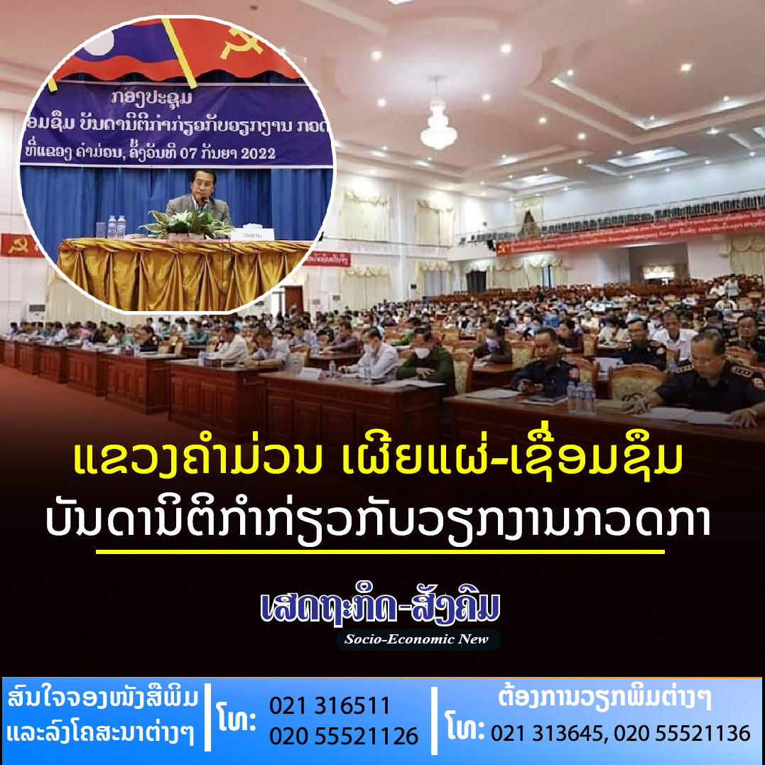 ໃນວັນທີ 7 ກັນຍາ 2022 ທີ່ສະໂມສອນຂອງແຂວງຄຳມ່ວນ ໄດ້ຈັດກອງປະຊຸມເຜີຍແຜ່-ເຊື່ອມຊຶມ ບັນດານິຕິກໍາກ່ຽວກັບວຽກງານກວດກາໃຫ້ບັນດາຂະແໜງການ, ອົງການຈັດຕັ້ງລັດໃນທົ່ວແຂວງໂດຍການເປັນກຽດເຂົ້າຮ່ວມຂອງທ່ານ ວັນໄຊ ພອງສະຫວັນ ກໍາມະການສູນກາງພັກ,