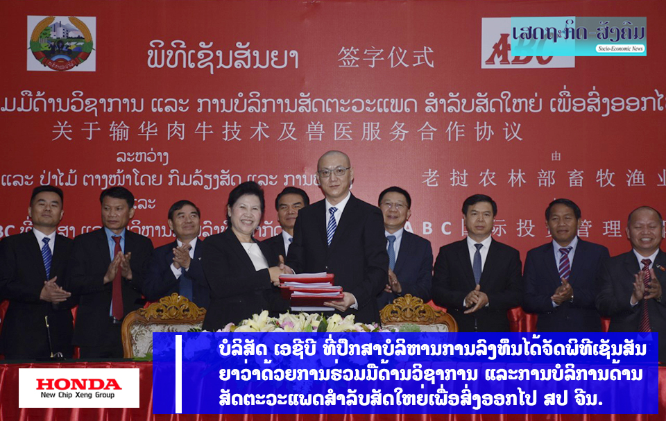 ວັນທີ 31 ມີນາ 2021 ທີ່ນະຄອນຫຼວງວຽງຈັນ ກົມລ້ຽງສັດ ແລະປະມົງ, ກະຊວງກະສິກໍາ ແລະປ່າໄມ້ ແລະບໍລິສັດ ເອຊີບີ ທີ່ປຶກສາບໍລິຫານການລົງທຶນໄດ້ຈັດພິທີເຊັນສັນຍາວ່າດ້ວຍການຮ່ວມມືດ້ານວິຊາການ ແລະການບໍລິການດ້ານສັດຕະວະແພດສໍາລັບສັດໃຫຍ່ເພື່ອສົ່ງອອກໄປ ສປ ຈີນ