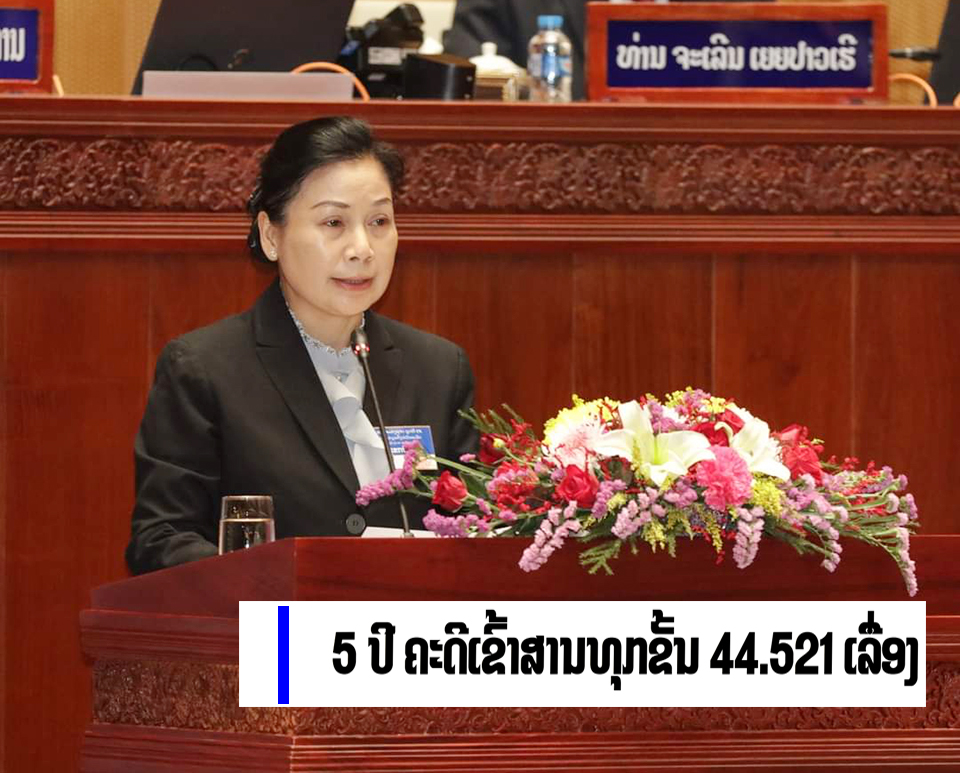 ໃນໄລຍະ 5 ປີ ຜ່ານມາສານປະຊາຊົນສູງສຸດໄດ້ຕິດຕາມກວດກາການປະຕິບັດການຕັດສິນຄະດີຕາມຂະບວນການຍຸຕິທຳໂດຍມີຄະດີເຂົ້າສານປະຊາຊົນ ແລະສານທະຫານທຸກຂັ້ນທັງໝົດ 44.521 ເລື່ອງ,ໃນນີ້,ມີຄະດີທີ່ຄ້າງມາ 1.606 ເລື່ອງ,