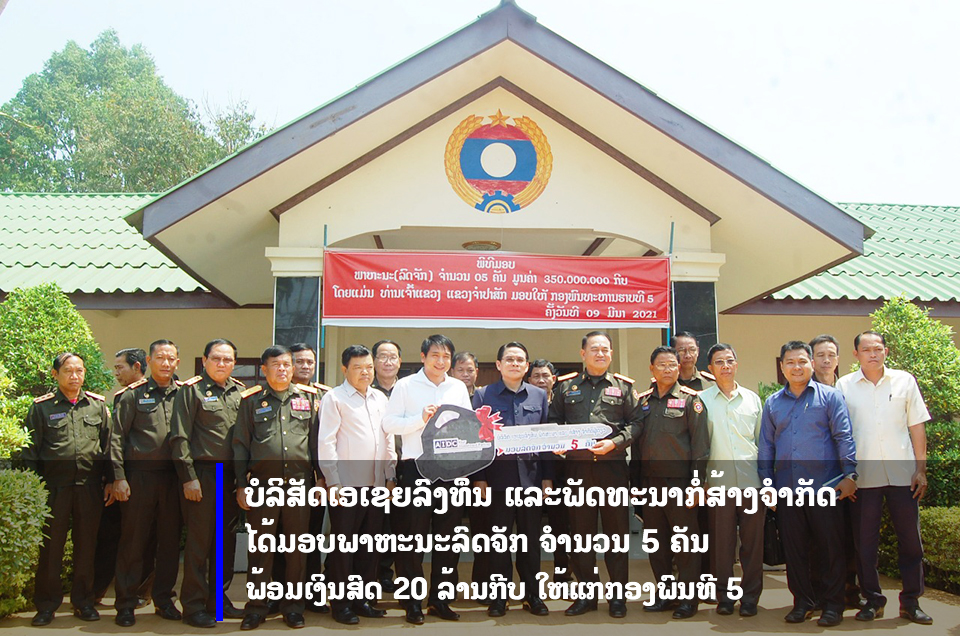 ໃນບໍລິສັດເອເຊຍລົງທຶນ ແລະພັດທະນາກໍ່ສ້າງຈຳກັດ ໄດ້ມອບພາຫະນະລົດຈັກ ຈຳນວນ 5 ຄັນ ພ້ອມເງິນສົດ 20 ລ້ານກີບ ໃຫ້ແກ່ກອງພົນທີ 5 ເພື່ອນຳໃຊ້ເຂົ້າໃນການປະຕິບັດໜ້າທີ່ປົກປັກຮັກສາປະເທດຊາດໃນເຂດທຸລະການດານ.