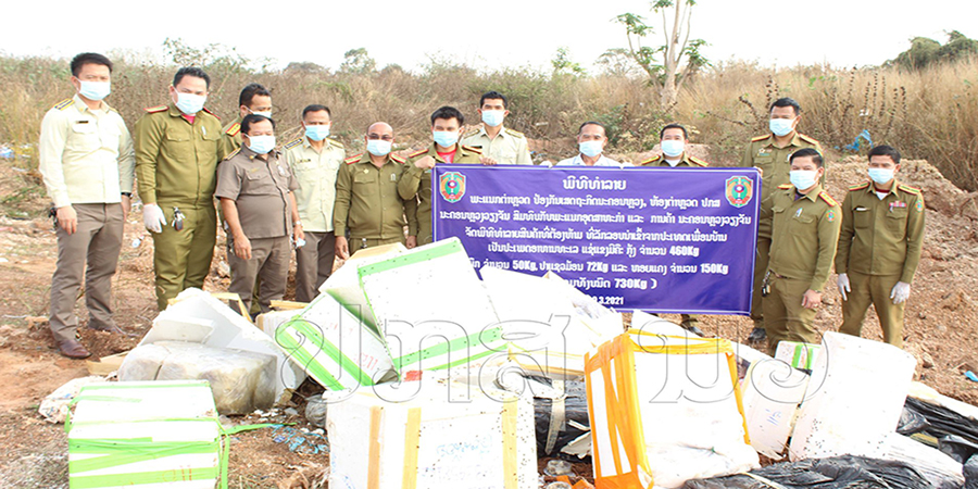 ພະແນກຕໍາຫຼວດປ້ອງກັນເສດຖະກິດຫ້ອງຕໍາຫຼວດ ປກສ ນວ ໄດ້ສົມທົບກັບພະແນກອຸດສາຫະກຳການຄ້ານະຄອນຫຼວງວຽງຈັນໄດ້ທໍາລາຍສິນຄ້າຫ້າມນໍາເຂົ້າທີ່ບໍ່ຖືກ ຕ້ອງ (ປະເພດອາຫານທະເລແຊ່ແຂງ) ລວມນໍ້າໜັກທັງໝົດ 730 ກິໂລກຣາມ,