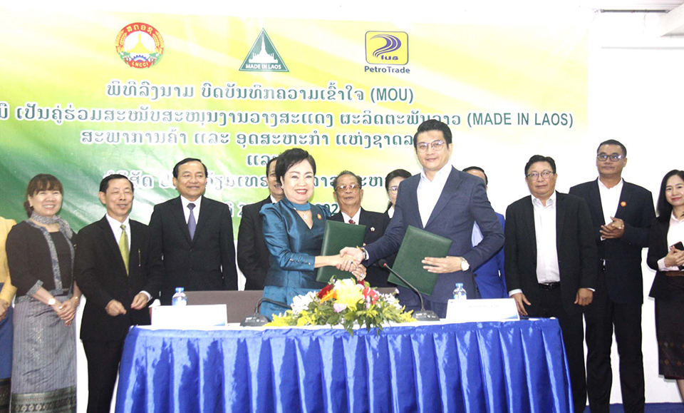 ວັນທີ 26 ມັງກອນຜ່ານມາທີ່ສະພາການຄ້າ ແລະອຸດສາຫະກຳແຫ່ງຊາດ (ສຄອຊ) ໄດ້ມີພິທີເຊັນບົດບັນທຶກຄວາມເຂົ້າໃຈລະຫວ່າງ ສຄອຊ ແລະບໍລິສັດປີໂຕຣລ້ຽມເທຣດດິ້ງລາວມະຫາຊົນ, ລົງນາມເຊັນສັນຍາໂດຍທ່ານ ນາງ ຈັນທະຈອນ ວົງໄຊ ຮອງປະທານສະພາການຄ້າ