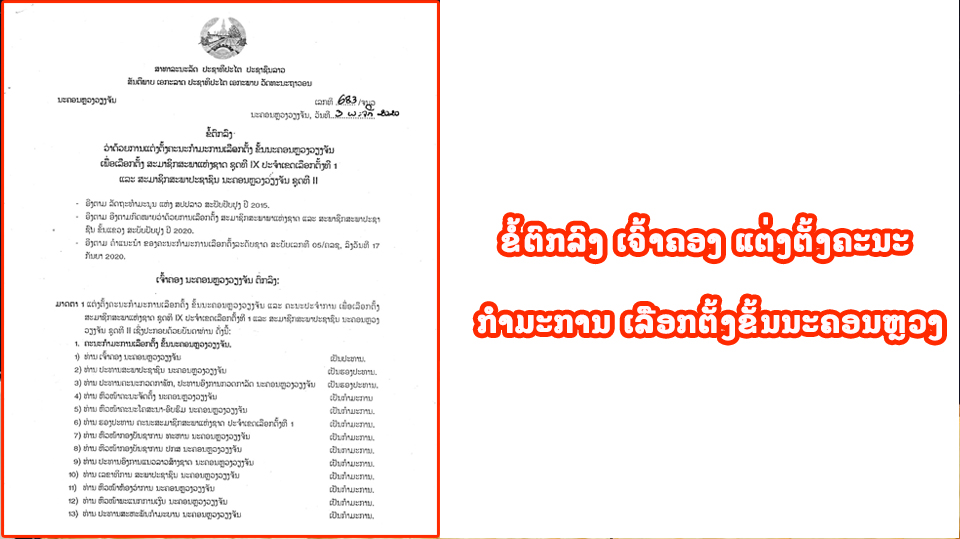 ວ່າດ້ວຍການແຕ່ງຕັ້ງຄະນະກຳມະການເລືອກຕັ້ງ ຂັ້ນນະຄອນຫຼວງວຽງຈັນເພື່ອເລືອກຕັ້ງ ສະມາຊິກສະພາແຫ່ງຊາດ ຊຸດທີ IX ປະຈຳເຂດເລືອກຕັ້ງທີ 1 ແລະສະມາ ຊິກສະພາປະຊາຊົນ ນະຄອນຫຼວງວຽງຈັນ ຊຸດທີ II