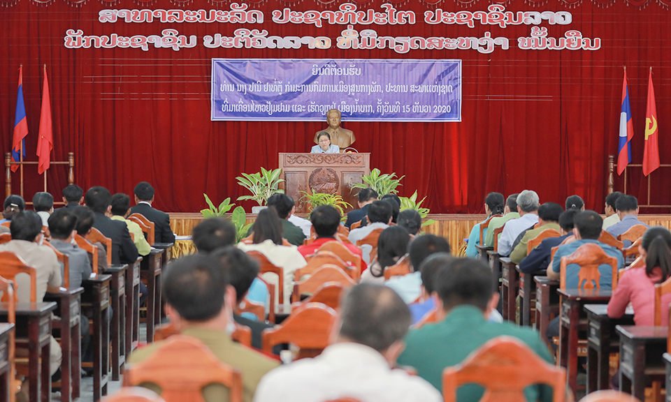 (ສພຊ) ວັນທີ 15 ທັນວາຜ່ານມາ, ທີ່ສະໂມສອນເມືອງນໍ້າບາກ ແຂວງຫຼວງພະບາງ; ທ່ານ ນາງ ປານີ ຢາທໍ່ຕູ້ ປະທານສະພາແຫ່ງຊາດໄດ້ເຄື່ອນໄຫວຢ້ຽມຢາມ ແລະເຮັດວຽກຢູ່ເມືອງນໍ້າບາກ; ໂດຍການຕ້ອນຮັບຂອງທ່ານ ສາຍສະໝອນ ຄົມທະວົງ ປະທານສະພາປະຊາຊົນແຂວງຫຼວງພະບາງ,