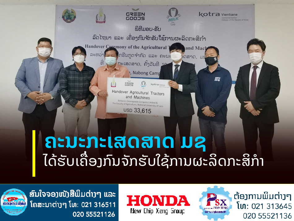 ພິທີມອບ-ຮັບລົດໄຖນາ ແລະເຄື່ອງກົນຈັກຮັບໃຊ້ການຜະລິດກະສິກໍາໃຫ້ແກ່ຄະນະກະເສດສາດມະຫາວິທະຍາໄລແຫ່ງຊາດ (ມຊ) ລວມມູນຄ່າ 33.615 ໂດລາ, ພ້ອມດ້ວຍມອບອຸປະກອນປ້ອງກັນໂຄວິດ-19 ໃຫ້ທາງຄະນະກະເສດສາດມະຫາວິທະຍາໄລແຫ່ງຊາດ (ມຊ)