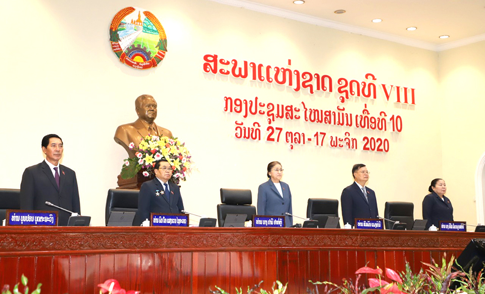 ກອງປະຊຸມສະໄໝສາມັນເທື່ອທີ 10 ຂອງສະພາແຫ່ງຊາດ ຊຸດທີ VIII ໄຂຂຶ້ນຢ່າງເປັນທາງການພາຍໃຕ້ການເປັນປະທານຂອງທ່ານ ນາງ ປານີ ຢາທໍ່ຕູ້ ປະທານສະພາແຫ່ງຊາດໂດຍໃຫ້ກຽດເຂົ້າຮ່ວມໃນພິທີມີ ທ່ານ ບຸນຍັງ ວໍລະຈິດ ປະທານປະເທດແຫ່ງ ສປປ ລາວ ພ້ອມດ້ວຍການນໍາພັກລັດ,