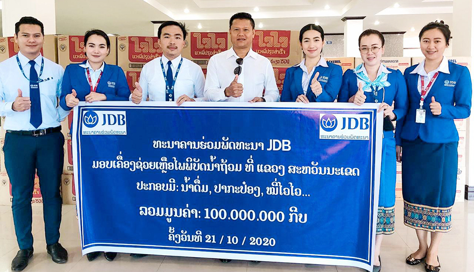ໃນວັນທີ 21 ຕຸລາ 2020 ທີ່ສໍານັກງານອົງການປົກຄອງແຂວງສະຫວັນນະເຂດທະນາຄານຮ່ວມພັດທະນາ ຫຼື JDB ໄດ້ມອບເຄື່ອງຊ່ວຍເຫຼືອໃຫ້ຜູ້ປະສົບໄພນໍ້າຖ້ວມທີ່ແຂວງສະຫວັນນະເຂດຊຶ່ງມອບໂດຍທ່ານ ຖາວອນ ອ້ວນມາລາ ຄະນະຜູ້ບໍລິຫານທະນາຄານຮ່ວມພັດທະນາ,