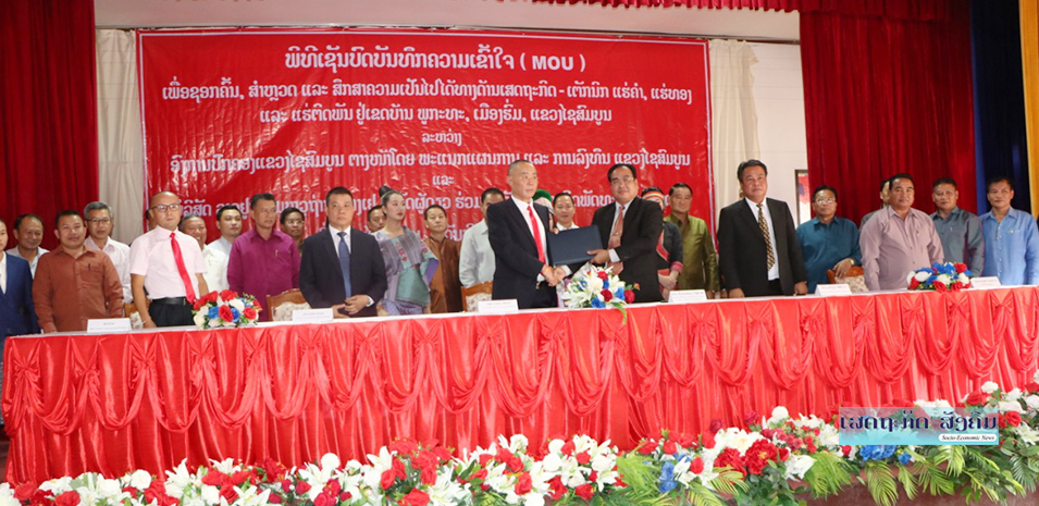 ພິທີເຊັນບົດບັນທຶກຄວາມເຂົ້າໃຈ ( MOU ) ເພື່ອຊອກຄົ້ນ, ສໍາຫຼວດ ແລະສຶກສາຄວາມເປັນໄປໄດ້ທາງດ້ານເສດຖະກິດ-ເຕັກນິກແຮ່ຄໍາ, ແຮ່ທອງ ແລະແຮ່ຕິດພັນຢູ່ເຂດບ້ານພູກະທະເມືອງຮົ່ມ ແຂວງໄຊສົມບູນ ລະຫວ່າງອົງການປົກຄອງແຂວງໄຊສົມບູນ