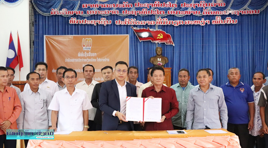 ພີທີເຊັນສັນຍາການເບີກຈ່າຍເງິນເດືອນ ແລະເງິນອຸດໜູນຜ່ານລະບົບບັນຊີຢູມັນນີ (U-money) ຂອງບໍລິສັດ ສະຕາວິນແທັກ ຊຶ່ງເປັນເຄືອຄ່າຍຂອງບໍລິສັດສະຕາໂທລະຄົມ ຫຼືຢູນິເທວໃຫ້ແກ່ນາຍບ້ານໃນທົ່ວເມືອງມະຫາໄຊ ແຂວງຄຳມ່ວນໄດ້ຈັດຂຶ້ນໃນວັນທີ 30 ກັນຍາ 2020 ທີ່ເມືອງມະຫາໄຊ