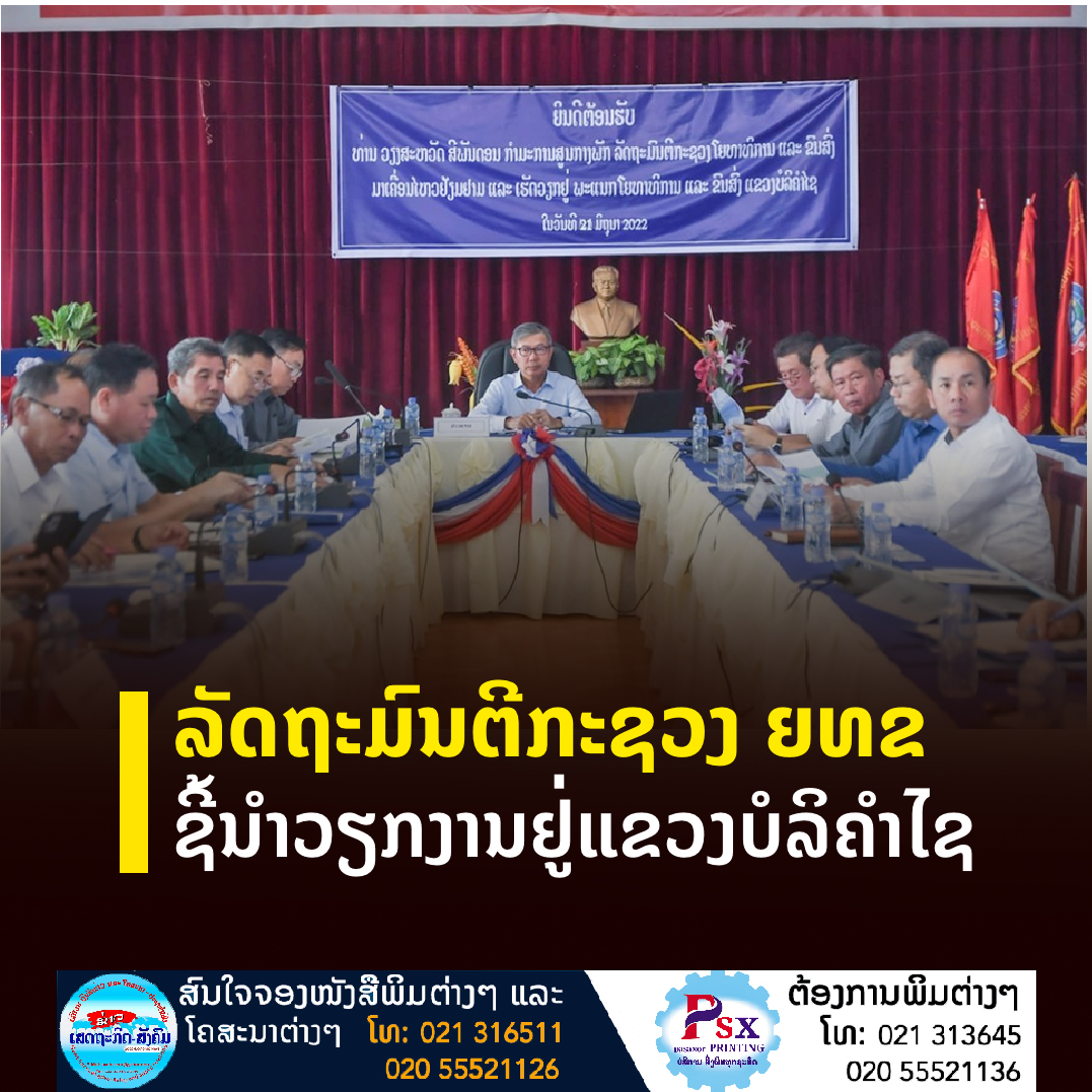 ໃນໂອກາດລົງເຄື່ອນໄຫວວຽກຢູ່ແຂວງບໍລິຄໍາໄຊໃນວັນທີ 21 ມິຖຸນາ ທີ່ຜ່ານມາທ່ານ ວຽງສະຫວັດ ສີພັນດອນ ລັດຖະມົນຕີກະຊວງໂຍທາທິການ ແລະຂົນສົງ(ຍທຂ) ໄດ້ໃຫ້ທິດຊີ້ນຳບາງວຽກງານຂອງພະນັກງານ ຍທຂ ແຂວງ ເປັນຕົ້ນ ການປະຕິບັດ 2 ວາລະແຫ່ງຊາດ,