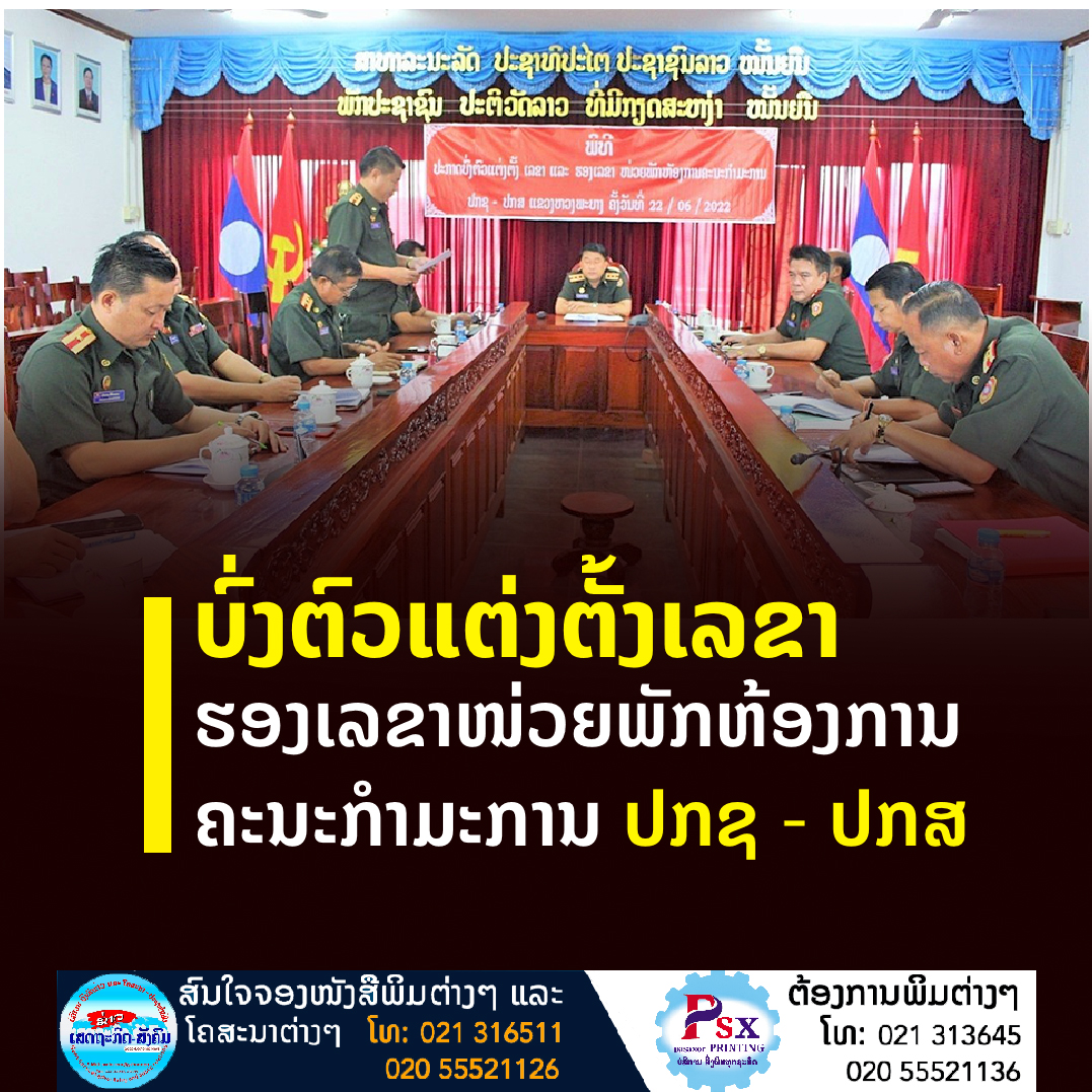 ທີປະກາດບົ່ງຕົວແຕ່ງຕັ້ງເລຂາ ແລະ ຮອງເລຂາໜ່ວຍພັກຫ້ອງການຄະນະກໍາມະການປ້ອງກັນຊາດ - ປ້ອງກັນຄວາມສະຫງົບ ແຂວງຫຼວງພະບາງ, ໄດ້ຈັດຂຶ້ນໃນວັນທີ 22 ມິຖຸນາ 2022 ໂດຍການເປັນປະທານຂອງ ທ່ານ ພັນໂທ ວິລະສິນ ມິດຕະພອນ ຄະນະພັກກອງບັນຊາການ,