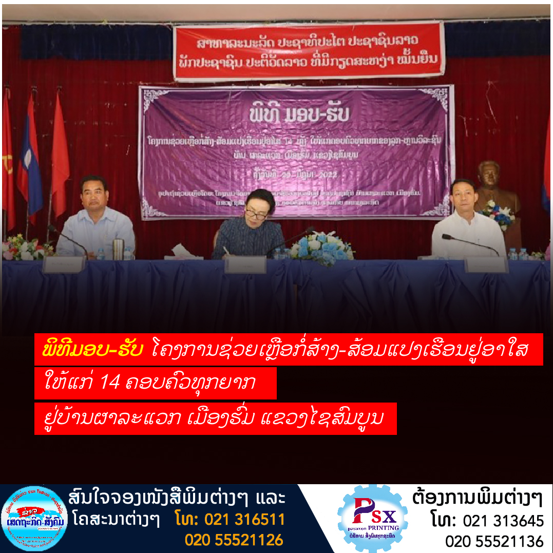 ພິທີມອບ-ຮັບ ໂຄງການຊ່ວຍເຫຼືອກໍ່ສ້າງ-ສ້ອມແປງເຮືອນຢູ່ອາໃສ ຈໍານວນ 14 ຫຼັງ ໃຫ້ແກ່ 14 ຄອບຄົວ ຂອງລູກຫຼານວິລະຊົນ ທີ່ທຸກຍາກຢູ່ບ້ານຜາລະແວກ ເມືອງຮົ່ມ ແຂວງໄຊສົມບູນ ໄດ້ຈັດຂຶ້ນໃນວັນທີ 20 ມິຖຸນາ 2022 ຢູ່ສະໂມສອນເມືອງຮົ່ມໂດຍເຂົ້າຮ່ວມພິທີໃນຄັ້ງນີ້ມີທ່ານ ພອຍຄໍາ ຮຸ່ງບຸນຍວງ,