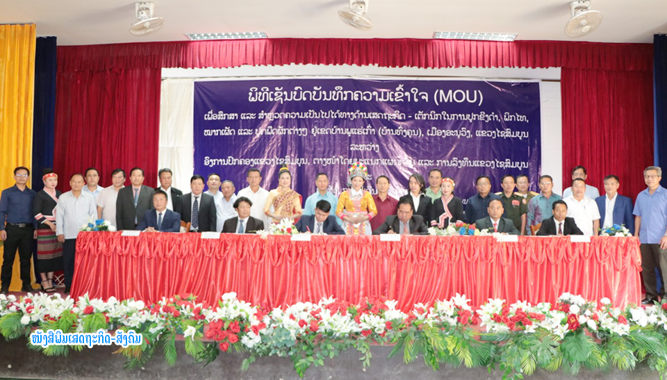ວັນທີ 11 ກັນຍາຜ່ານມາທີ່ສະໂມສອນກອງບັນຊາການທະຫານແຂວງໄຊສົມບູນ ໄດ້ມີພິທີເຊັນບົດບັນທຶກຄວາມເຂົ້າໃຈ (MOU) ເພື່ອສຶກສາ-ສໍາຫລວດຄວາມເປັນໄປໄດ້ທາງດ້ານເສດຖະກິດ-ເຕັກນິກໂຄງການປູກຂີງດໍາ, ພິກໄທ, ໝາກເຜັດ ແລະ ປູກພຶດຜັກຕ່າງໆ ຢູ່ເຂດບ້ານທົ່ງຄູນ (ບ້ານພູແຮ່ເກົ່າ)