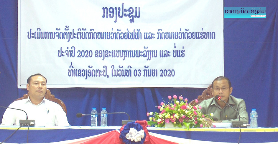 ວັນທີ 3 ກັນຍາ 2020 ແຂວງອັດຕະປື ໄດ້ຈັດກອງປະຊຸມປະເມີນການຈັດຕັ້ງປະຕິບັດກົດໝາຍວ່າດ້ວຍໄຟຟ້າ ແລະກົດໝາຍວ່າດ້ວຍແຮ່ທາດປະຈຳປີ 2020 ຂຶ້ນທີ່ຫ້ອງປະຊຸມສະພາປະຊາຊົນແຂວງ. ໂດຍການເປັນປະທານຂອງທ່ານ ວິທະຍາ ພົມມະຈັນ ຫົວໜ້າພະແນກພະລັງງານ ແລະບໍ່ແຮ່ແຂວງອັດຕະປື,
