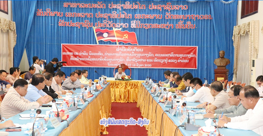 ທ່ານ ຄຳພັນ ພົມມະທັດ ຫົວໜ້າຄະນະໂຄສະນາອົບຮົມສູນກາງພັກທັງເປັນຫົວໜ້າຄະນະກຳມະການເນື້ອໃນກອງປະຊຸມໃຫຍ່ຂອງພັກໄດ້ເຄື່ອນໄຫວເຮັດວຽກພ້ອມໂອ້ລົມຕໍ່ການນຳພັກ-ລັດ ຂອງແຂວງຄຳມ່ວນໃນວັນທີ 12 ສິງຫາ 2020 ທີ່ເຮືອນຮັບແຂກເລກ 1 ຂອງແຂວງຄຳມ່ວນ,