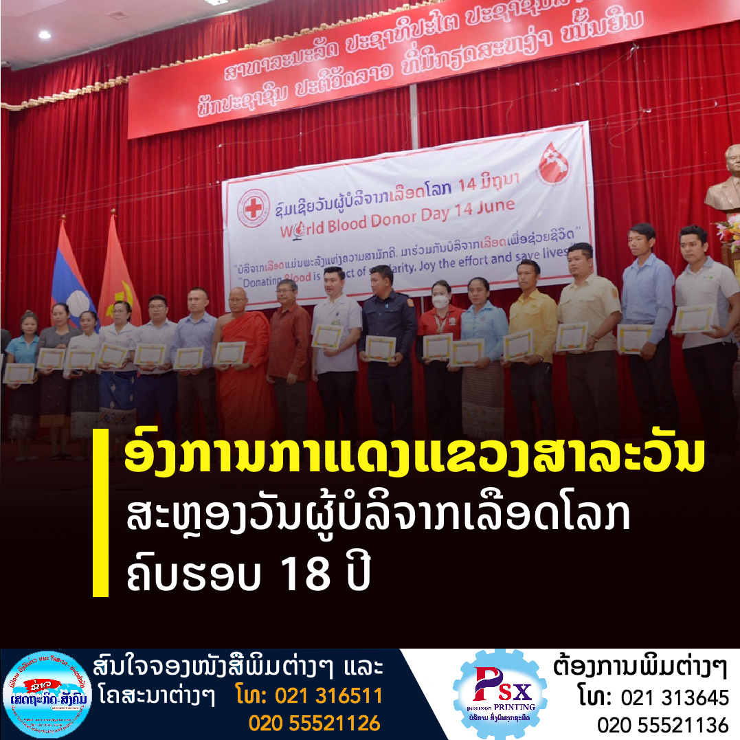 ອົງການກາແດງແຂວງສາລະວັນ ສະຫຼອງວັນຜູ້ບໍລິຈາກເລືອດໂລກ ຄົບຮອບ 18 ປີ.