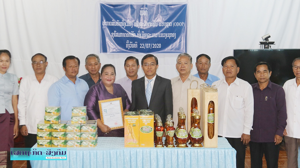 ພິທີມອບ-ຮັບໃບອະນຸຍາດນໍາໃຊ້ກາໝາຍໜຶ່ງເມືອງໜຶ່ງຜະລິດຕະພັນ (ODOP) ແຫ່ງຊາດໃຫ້ແກ່ເຈົ້າຂອງໂຮງງານຜະລິດຊາໂສມກາດອກຮັກເມືອງລະມາມແຂວງເຊກອງ ໄດ້ຈັດຂຶ້ນໃນວັນທີ 22 ກໍລະກົດ 2020 ທີ່ພະແນກອຸດສາຫະກໍາ ແລະການຄ້າແຂວງໂດຍມີທ່ານ ເຫຼັກໄຫຼ ສີວິໄລ ຮອງເຈົ້າແຂວງເຊກອງ;