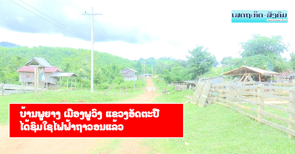 ລັດວິສາຫະກິດໄຟຟ້າລາວສາຂາ ແຂວງອັດຕະປື ໄດ້ເປີດການນຳຊົມໃຊ້ໄຟຟ້າ 100% ຢູ່ບ້ານພູຍາງ ເມືອງພູວົງ, ແຂວງອັດຕະປື, ເຊິ່ງພິທີເປີດການນໍາໃຊ້ໄດ້ຈັດຂຶ້ນຢ່າງເປັນທາງການໃນວັນທີ 17 ກໍລະກົດ ຜ່ານມາທີ່ເດີນໂຮງຮຽນປະຖົມບ້ານດັ່ງກ່າວ,