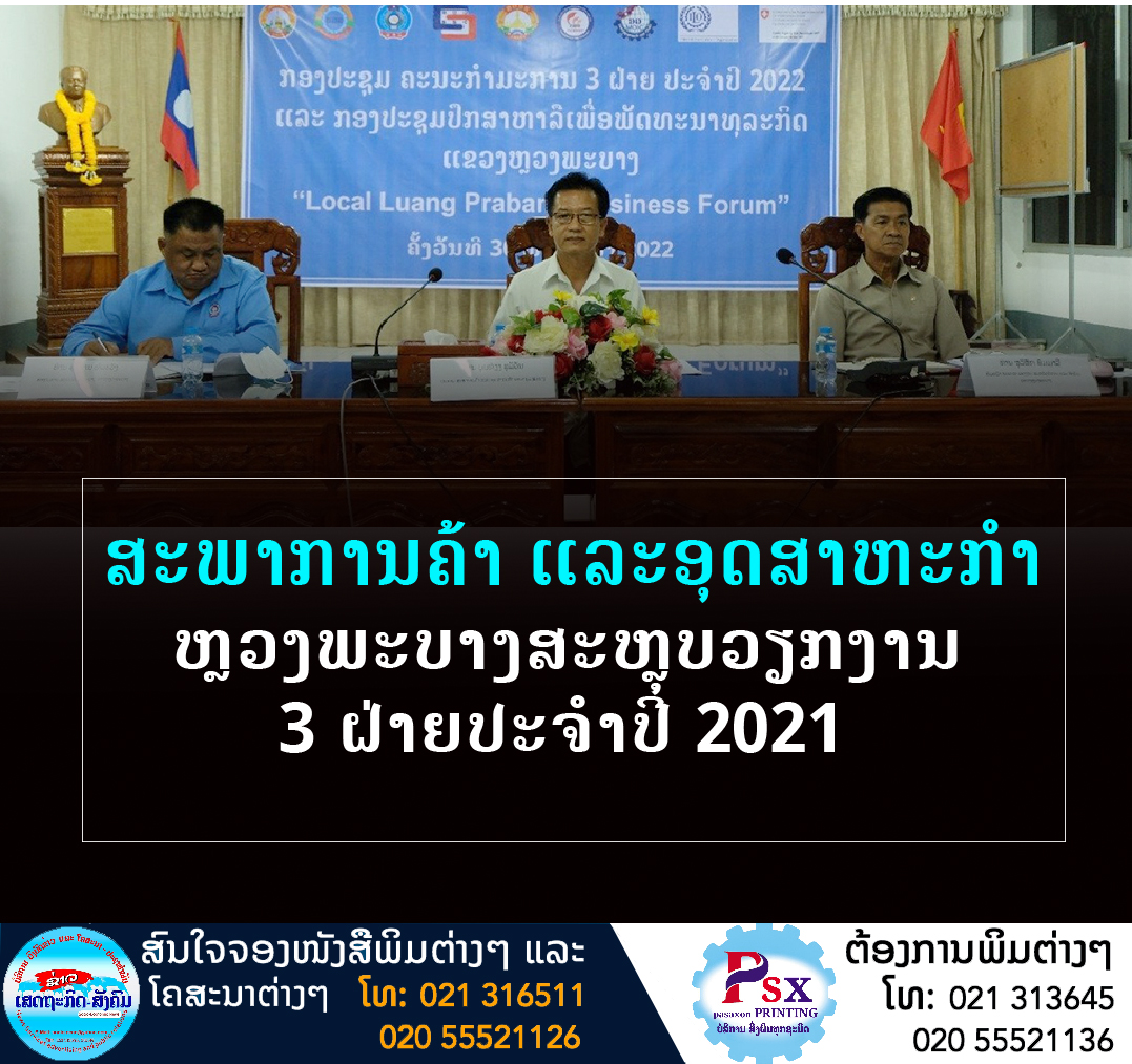 ແຫລ່ງຂ່າວຈາກ ແຂວງຫຼວງພະບາງ ໃຫ້ຮູ້ວ່າ: ເມື່ອບໍ່ດົນມານີ້, ສະພາການຄ້າ ແລະອຸດສາຫະກໍາ ແຂວງຫຼວງພະບາງ ຈັດກອງປະຊຸມສະຫຼຸບວຽກງານ 3 ຝ່າຍຄື ສະພາການຄ້າ ແລະ ອຸດສາຫະກໍາ, ພະແນກແຮງງານ ແລະ ສະຫວັດດີການສັງຄົມ ແລະ ສະຫະພັນກໍາມະບານແຂວງ ປະຈໍາປີ 2021,