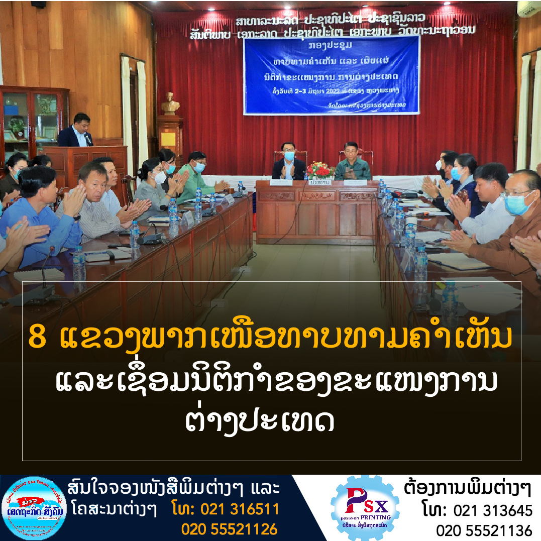 ວັນທີ 2 ມິຖຸນາ 2022 ທີ່ຫ້ອງປະຊຸມພະແນກກະສິກຳ ແລະປ່າໄມ້ ແຂວງຫຼວງພະບາງ, ກະຊວງການຕ່າງປະເທດໄດ້ຈັດຕັ້ງກອງປະຊຸມທາບທາມຄຳເຫັນ ແລະ ເຜີຍແຜ່ ນິຕິກຳຂະແໜງການການຕ່າງປະເທດ ຕໍ່ບັນດາ 8 ແຂວງພາກເໜືອ