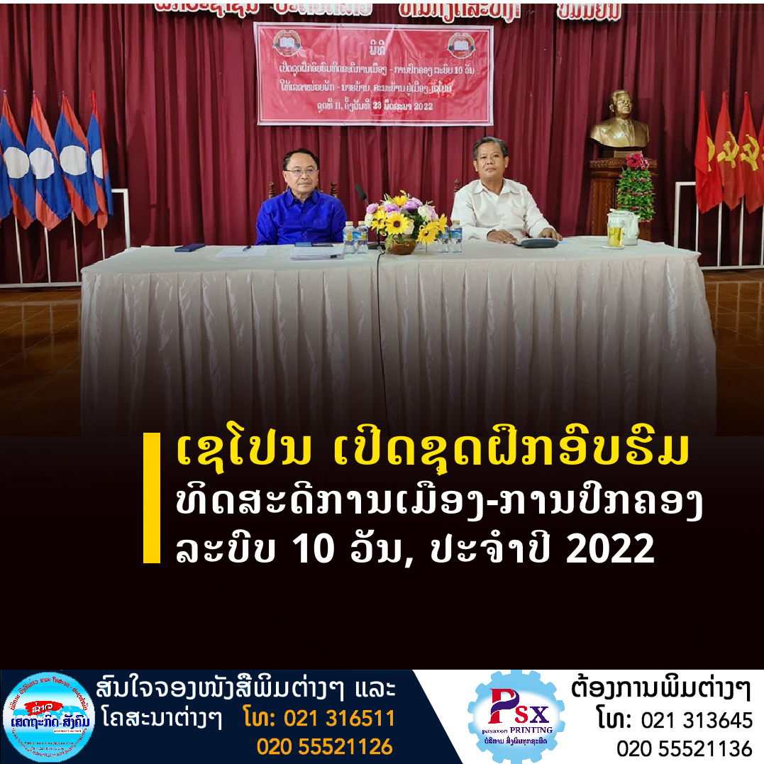ໃນວັນທີ 23 ພຶດສະພາ 2022 ທີ່ສະໂມສອນ ເມືອງເຊໂປນ ແຂວງສະຫວັນນະເຂດ ໄດ້ເປີດຊຸດຝຶກອົບຮົມທິດສະດີການເມືອງ-ການປົກຄອງລະບົບ 10 ວັນ ຊຸດທີ II ໃຫ້ເລຂາໜ່ວຍພັກ-ນາຍບ້ານ ແລະ ຄະນະບ້ານໃນທົ່ວເມືອງ ປະຈໍາປີ 2022 ຂຶ້ນ,