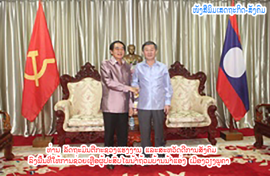 ວັນທີ 14 ກໍລະກົດ 2020 ນີ້ ທ່ານ ປອ ຄຳແພງ ໄຊສົມແພງ ລັດຖະມົນຕີກະຊວງແຮງງານ ແລະສະຫວັດດີການສັງຄົມພ້ອມດ້ວຍຄະນະໄດ້ລົງພື້ນທີ່ຕົວຈິງໃນການຊຸກຍູ້ໃຫ້ກໍາລັງໃຈປະຊາຊົນບ້ານນໍ້າແອ່ງເມືອງວຽງພູຄາ ແຂວງຫຼວງນໍ້າທາທີ່ໄດ້ຮັບຜົນກະທົບໄພນໍ້າຖ້ວມ,
