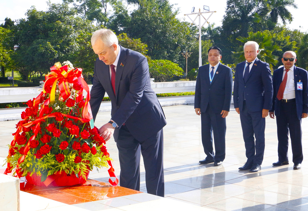 ຄະນະຜູ້ແທນ ສ ເບລາຣຸດຊີ ວາງກະຕ່າດອກໄມ້ ຢູ່ພິພິທະພັນໄກສອນ ພົມວິຫານ