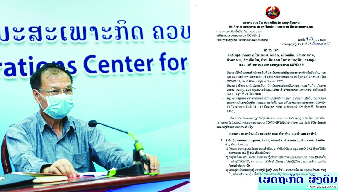 ພາກທຸລະກິດບໍລິການທ່ອງທ່ຽວເປັນຕົ້ນໂຮງແຮມ, ຣີສອດ, ເຮືອນພັກ, ຮ້ານອາຫານ, ຮ້ານກາເຟ ແລະ ຮ້ານເສີມຄວາມງາມພາຍຫຼັງທີ່ລັດຖະບານມີນະໂຍບາຍຜ່ອນ ຜັນໃຫ້ເປີດບໍລິການຕາມຄວາມຮຽກຮ້ອງຂອງສັງຄົມ ແລະຜູ້ປະ ການ ຕ້ອງເອົາໃຈໃສ່ຢ່າງເຂັ້ມງວດຕໍ່ມາດຕະການປ້ອງກັນພະຍາດໂຄວິດ-19