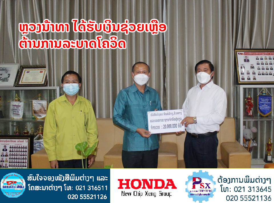 ວັນທີ 16 ພະຈິກ 2021 ທ່ານ ອ່ອນຈັນ ຄຳພາວົງ ຮອງເຈົ້າແຂວງໆຫຼວງນໍ້າທາໄດ້ຮັບເງິນຊ່ວຍເຫຼືອຈຳນວນ 20 ລ້ານກີບ ຈາກທ່ານ ຄຳຜາຍ ໄຊພະຈັນ ອຳນວຍການບໍລິສັດ ໄຊພະຈັນ ກໍ່ສ້າງ, ຂົວທາງ ແລະເຄຫາສະຖານຈຳກັດຜູ້ດຽວເພື່ອນຳໃຊ້ເຂົ້າໃນການປ້ອງກັນ,
