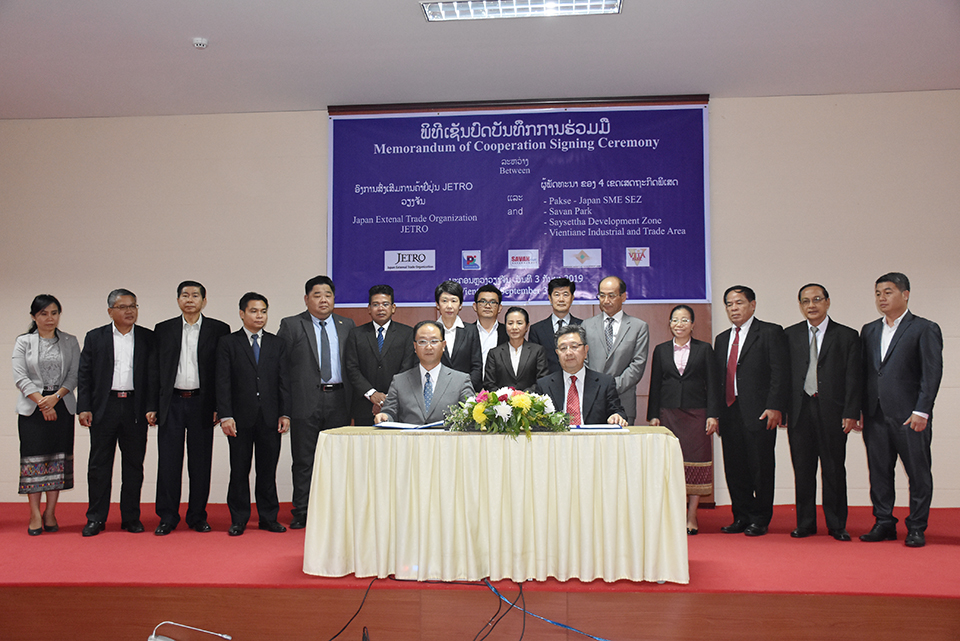 ວັນທີ 3 ກັນຍາ 2019, ທີ່ຫ້ອງການຄຸ້ມຄອງເຂດເສດຖະກິດພິເສດ ນະຄອນຫຼວງວຽງຈັນ ໄດ້ມີພິທີເຊັນບົດບັນທຶກການຮ່ວມມືລະຫວ່າງອົງການສົ່ງເສີມການຄ້າຍີ່ປຸ່ນ ເຈໂຕຣ (JETRO) ວຽງຈັນ