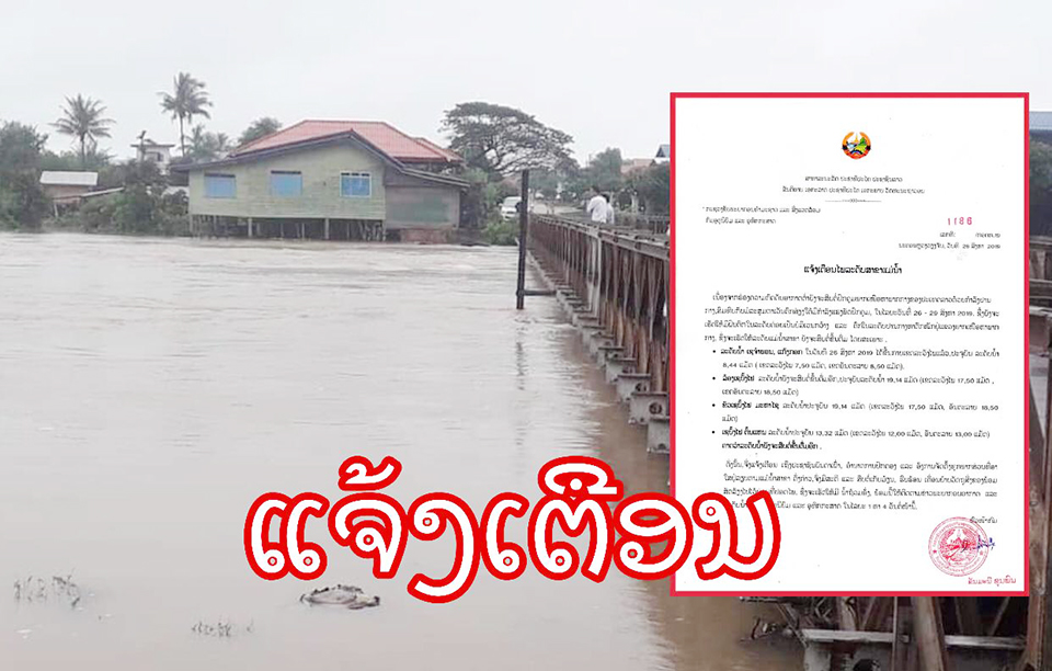 ກົມອຸຕຸນິຍົມ ແລະອຸທົກກະສາດອອກແຈ້ງເຕືອນໄພ ລະດັບນໍ້າສາຂາແມ່ນໍ້າທີ່ກຳລັງສູງຂຶ້ນ, ລະຫວ່າງວັນທີ 26-29 ສິງຫາ 2019