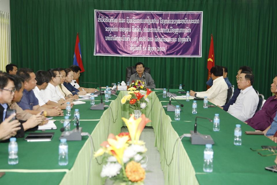ໃນຕອນເຊົ້າວັນທີ 14 ສິງຫາ 2019 ທ່ານ ທອງລຸນ ສີສຸລິດ, ນາຍົກລັດຖະມົນຕີ, ພອ້ມດວ້ຍ ທ່ານລັດຖະມົນຕີ ແລະ ຮອງລັດຖະມົນຕີກະຊວງກ່ຽວຂ້ອງໄດ້ໄປເຄື່ອນໄຫວຢ້ຽມຢາມ ແລະຊຸກຍູ້ການຜະລິດຢູ່ແຂວງສະຫວັນນະເຂດ ໂດຍມີທ່ານ ສັນຕິພາບ ພົມວິຫານ, ເຈົ້າແຂວງໆສະຫວັນນະເຂດ ພ້ອມດ້ວຍຄະນະ ແລະ ພາກ ສ່ວນທີ່ກ່ຽວຂ້ອງໃຫ້ການຕ້ອນຮັບ.