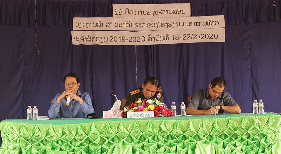 ພິທີສະຫຼຸບການຮຽນ-ການສອນວິຊາສຶກສາປ້ອງກັນຊາດປະຈໍາສົກຮຽນ 2019-2020 ຂອງໂຮງຮຽນມັດທະຍົມສົມບູນ ແກ່ນທ້າວ ເມືອງແກ່ນທ້າວ ແຂວງໄຊຍະບູລີ ໄດ້ຈັດຂຶ້ນໃນວັນທີ 24 ກຸມພາ ຜ່ານມາພາຍຫຼັງທີ່ໄດ້ດໍາເນີນມາເປັນເວລາ 5 ວັນ ທີ່ໂຮງຮຽນດັ່ງກ່າວ