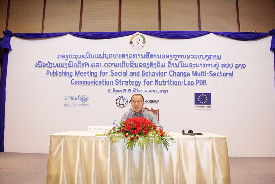 ວັນທີ 1 ສິງຫາ ທີ່ນະຄອນຫຼວງວຽງຈັນ ໄດ້ຈັດກອງປະຊຸມເຜີຍແຜ່ຍຸດທະສາດການສື່ສານຂອງຫຼາຍຂະແໜງການເພື່ອປ່ຽນແປງພຶດຕິກໍາ ແລະຄວາມເຄີຍຊິນຂອງສັງຄົມດ້ານໂພຊະນາການໂດຍການເປັນປະທານຂອງທ່ານ ບຸນເພັງ ພິລາວົງ ຫົວໜ້າກົມອະນາໄມ ແລະສົ່ງເສີມສຸຂະພາບກະຊວງສາທາລະນະສຸກ,