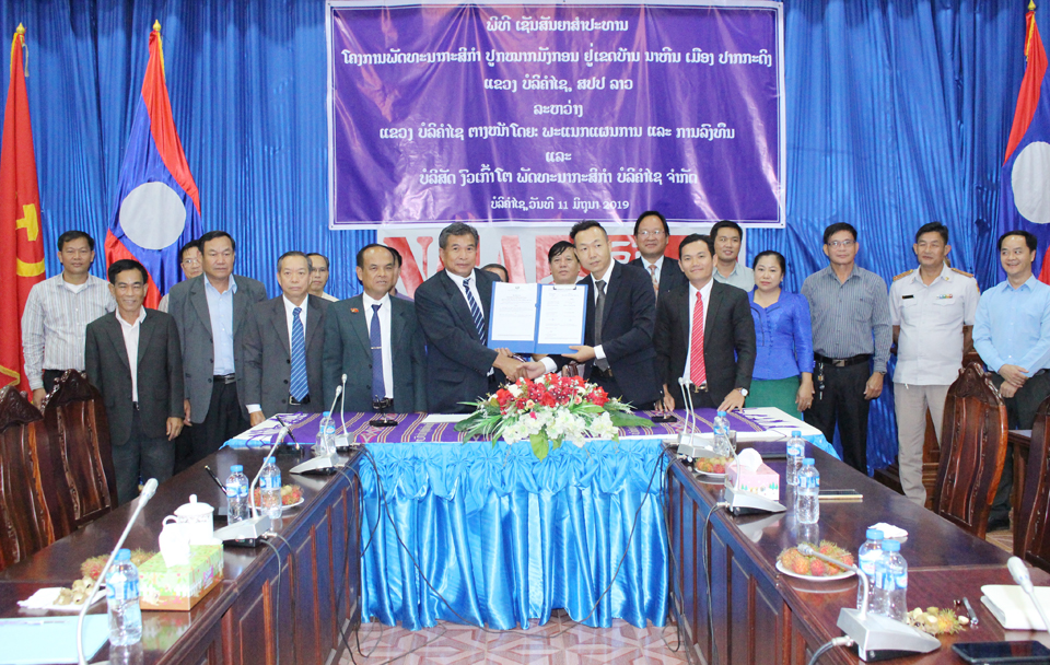 ພິທີລົງນາມເຊັນບົດບັນທຶກສຳປະທານທີ່ດິນໂຄງການພັດທະນາກະສິກຳປູກໝາກມັງກອນຢູ່ເຂດບ້ານນາຫີນ ເມືອງປາກກະດິງ ໄດ້ຈັດຂຶ້ນໃນວັນທີ 11 ມິຖຸນານີ້ທີ່ແຂວງບໍລິຄຳໄຊ ລະຫວ່າງ ທ່ານ ເລື່ອນວິໄລ ຈັນທະລາພັນ ຫົວໜ້າພະແນກແຜນການ ແລະ ການທຶນແຂວງເຊັນໃນນາມຕາງໜ້າຝ່າຍລັດ ແລະ ທ່ານ ເໜົາຮົງ ຕ່າວ ປະທານບໍລິສັດງົວເກົ້າໂຕພັດທະນາກະສິກຳບໍລິຄຳໄຊ ຈຳກັດ