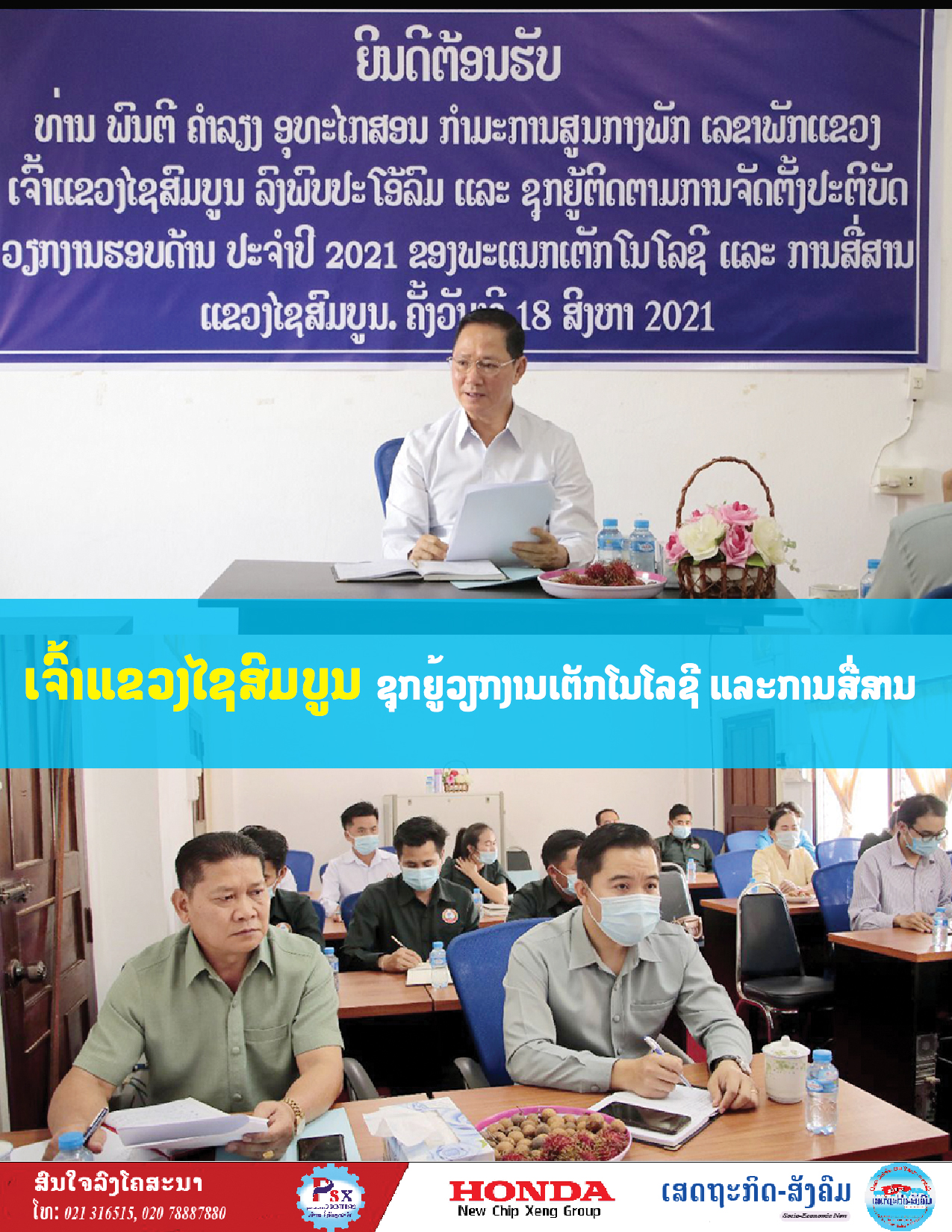 ໃນວັນທີ 18 ສິງຫາຜ່ານມາ, ທ່ານ ພົນຕີ ຄຳລຽງ ອຸທະໄກສອນ ເຈົ້າແຂວງໄຊສົມບູນໄດ້ລົງພົບປະໂອ້ລົມ ແລະຊຸກຍູ້ຕິດຕາມການຈັດຕັ້ງປະຕິບັດວຽກງານຮອບດ້ານປະຈຳປີ 2021 ຂອງພະແນກເຕັກໂນໂລຊີ ແລະການສື່ສານແຂວງໂດຍໄດ້ຮັບຟັງການລາຍງານກ່ຽວກັບການຈັດຕັ້ງປະຕິບັດວຽກງານປະຈຳ 6 ເດືອນຕົ້ນປີ