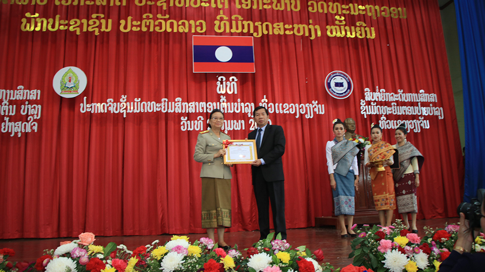 ວັນທີ 21 ກຸມພາຜ່ານມາ ທີ່ສະໂມສອນຂອງແຂວງວຽງ ຈັນໄດ້ມີພິທີປະກາດຈົບຊັ້ນມັດທະຍົມຕອນຕົ້ນບຳລຸງ ໂດຍການເປັນປະທານຂອງທ່ານ ຄຳພັນ ສິດທິ ດຳພາ ເຈົ້າແຂວງວຽງຈັນ, ເຂົ້າຮ່ວມຂອງທ່ານ ນາງ ແສງເດືອນ ຫຼ້າຈັນທະບູນ ລັດຖະມົນຕີກະຊວງສຶກສາທິການ ແລະກີລາ,