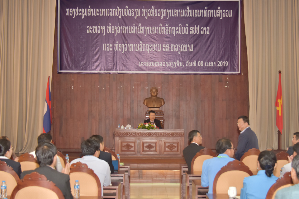 ໃນວັນທີ 8 ເມສາ 2019 ຫ້ອງວ່າການສຳນັກງານນາຍົກລັດຖະມົນຕີ (ສນຍ) ໄດ້ຈັດກອງປະຊຸມສຳມະນາແລກປ່ຽນບົດຮຽນກ່ຽວກັບວຽກງານການເປັນເສ ນາທິການສັງລວມລະຫວ່າງຫ້ອງວ່າການສຳນັກງານນາຍົກລັດຖະມົນຕີແຫ່ງ ສປປ ລາວ ແລະຫ້ອງວ່າການລັດຖະບານແຫ່ງ ສສ ຫວຽດນາມ,
