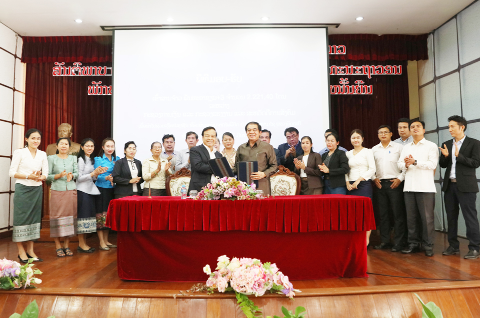 ກະຊວງການເງິນໄດ້ມອບເຂົ້າສານຈ້າວຄັງແຮເຂົ້າອາຊຽນ +3 ຕາມພັນທະຂອງລັດຖະບານ ສປປ ລາວ ຈໍານວນ 2.221,40 ໂຕນ ລວມມູນຄ່າ 16,66 ຕື້ກີບໃຫ້ກະຊວງແຮງງານ ແລະສະຫວັດດີການສັງຄົມ, ເພື່ອນໍາໄປຊ່ວຍເຫຼືອປະຊາຊົນທີ່ໄດ້ຮັບຜົນກະທົບຈາກໄພພິບັດຢູ່ເມືອງສະໜາມໄຊ ແຂວງອັດຕະປື, ໂດຍມີພິທີເຊັນບົດບັນທຶກມອບ-ຮັບຂຶ້ນໃນວັນ ທີ 7 ມີນາ 2019